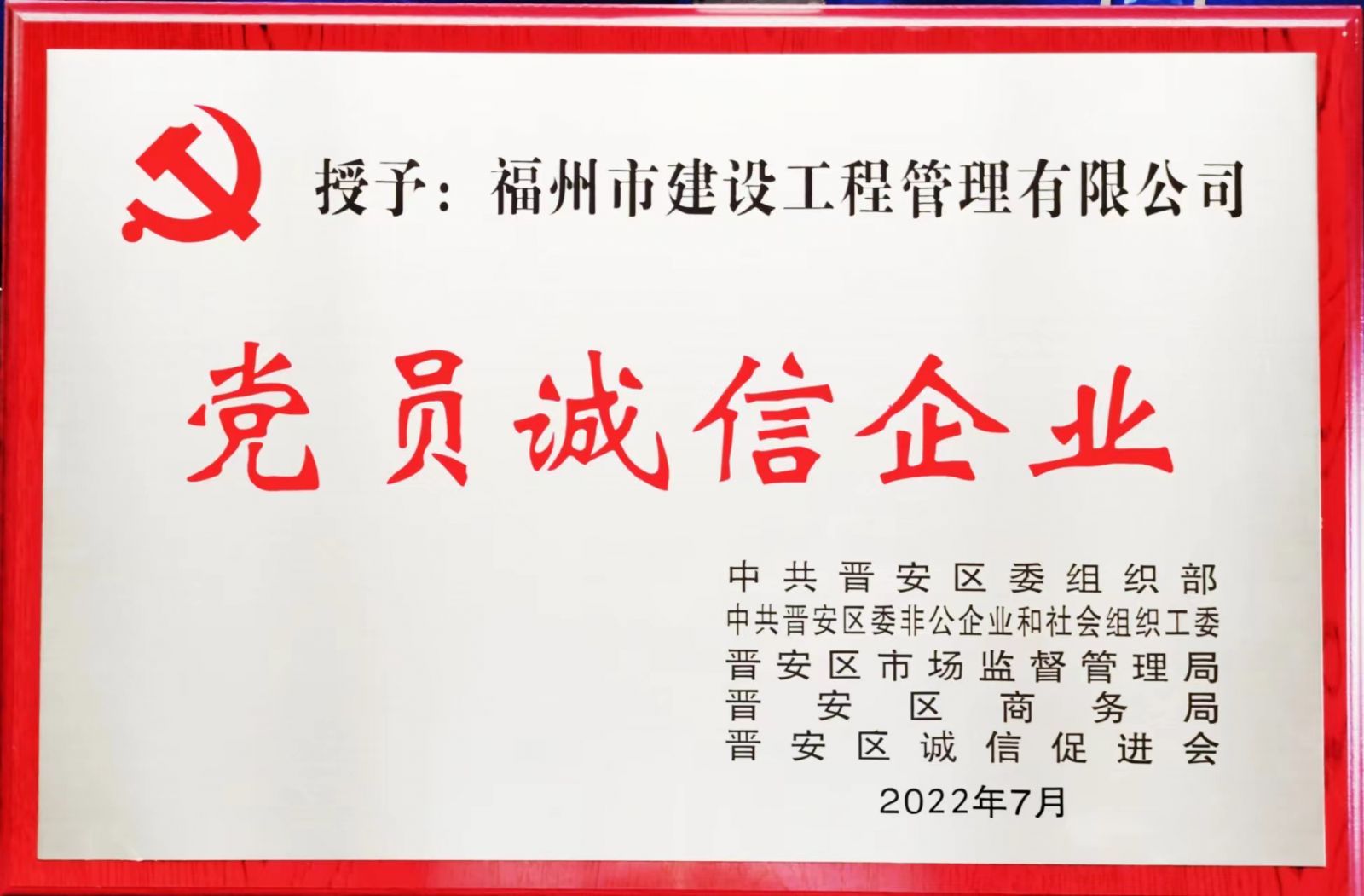 9月22日上午,晉安區(qū)委組織部等部門聯(lián)合舉辦晉安區(qū)第二批“黨員誠信示范店”“黨員誠信企業(yè)”授牌表彰會,我司榮獲“黨員誠信企業(yè)”榮譽(yù)稱號。這個(gè)稱號是對我司長期以來誠信經(jīng)營的肯定,也是對我們今后堅(jiān)持誠信合法經(jīng)營的一種鞭策。